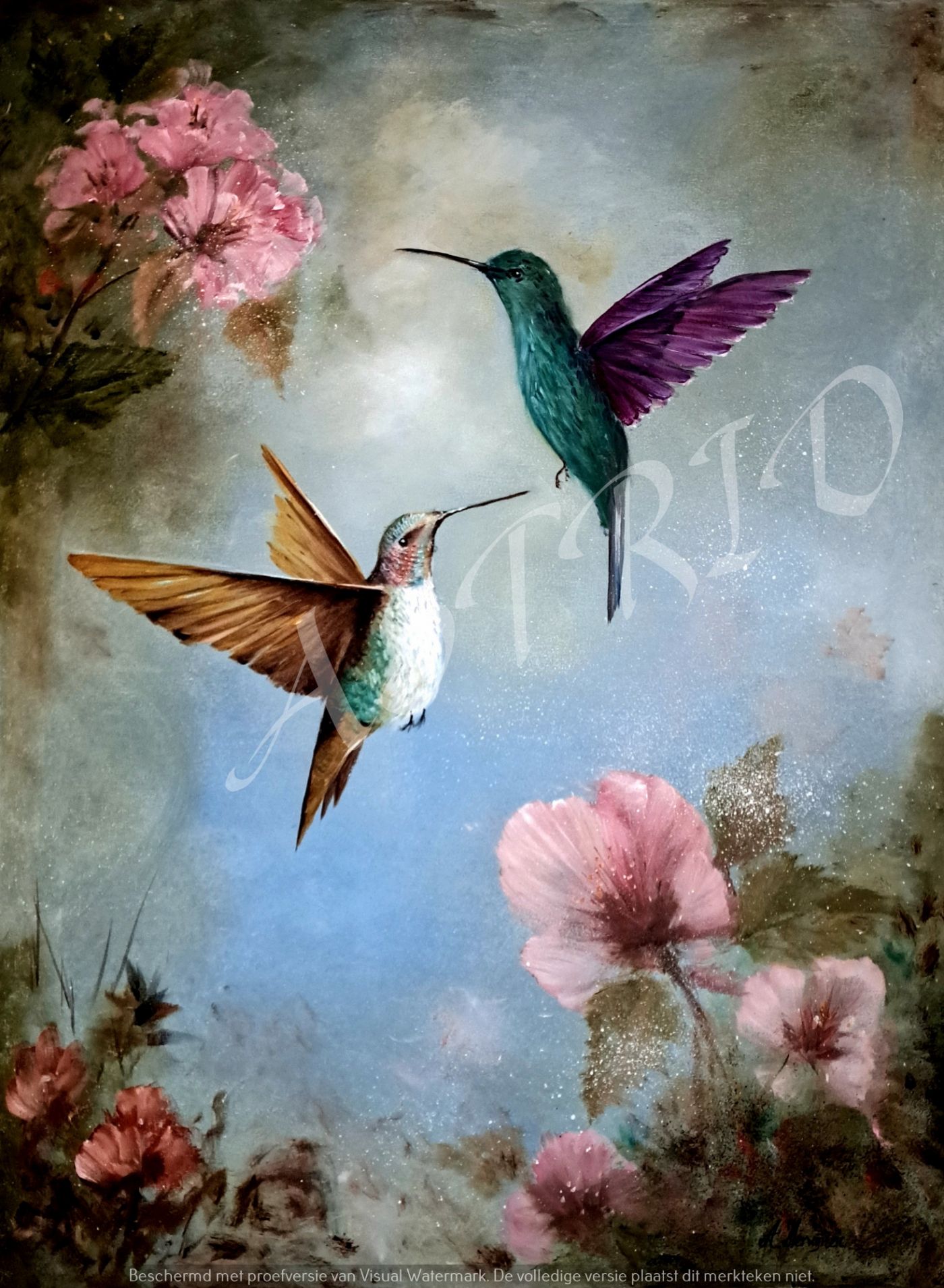 zie ze gaan, 2 kolibries vrij in de lucht. vast gelegd met olieverf op doek